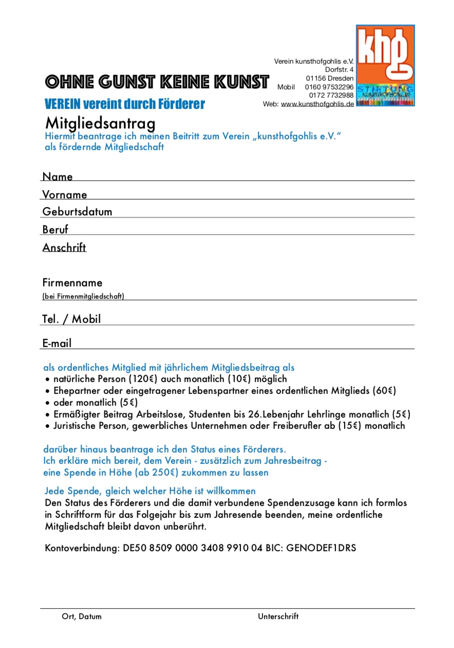 Füllt bitte unseren Mitgliedsantrag aus und schafft durch Euren Mitgliedsbeitrag eine weitere Grundlage für die Erhaltung und die Zukunftsfähigkeit des Projektes „kunsthofgohlis“.