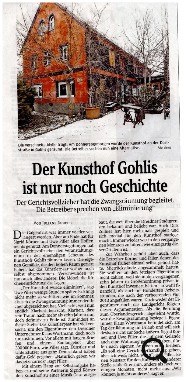 Als wir den Schock und die Lethargie nach der Räumung überwunden hatten, machten wir uns auf den Weg, eine Alternative und eine Perspektive für den Kunsthof zu finden. Nach einigen Vorschlägen und Angeboten, wurde uns eine Ausschreibung der Stadt Dresden offeriert, in der die Stadt für ein Kulturobjekt, das sich im Eigentum der Städtischen Immobilienverwaltung befindet, eine Nutzung sucht, die haargenau unserem Konzept des kunsthofgohlis entspricht. Die Stadt bietet uns in ihrer Offerte eine Vergabe eines Erbbaurechts für 35 Jahre über das Gebäude inclusive 3.000m2 Gartengrundstück zu einer moderaten Pachtzahlung an. Das Gebäude steht unter Denkmalschutz und hat alle Voraussetzungen für die Fortführung unseres Projektes kunsthofgohlis. In den letzten Wochen haben wir uns akribisch auf die Abgabe eines Angebotes vorbereitet und in diesem Zusammenhang einen Verein „kunsthofgohlis e.V.“ gegründet, der in Gemeinschaft mit der STIFTUNG-kunsthofgohlis als Träger des Projektes das Angebot erstellte. Es wird noch separat einen Aufruf folgen, in unserem Verein mitzuarbeiten und damit wieder zu einem Teil unseres Projektes und unserer Gemeinschaft zu werden.